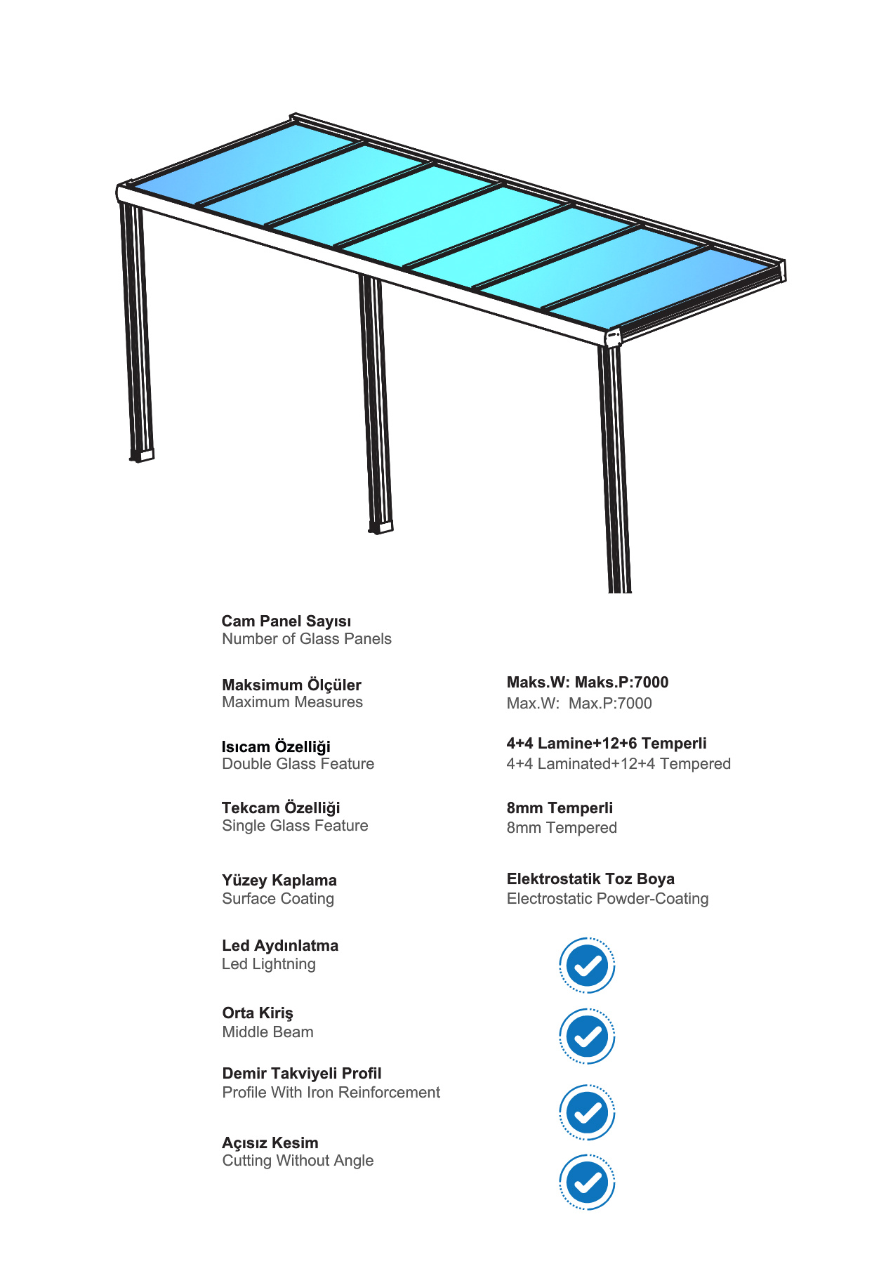 Kış aylarında yağmur, kar ve soğuğu dışarıda tutarken, yaz aylarında güneşin keyfini çıkarma fırsatı verir. Giyotin, zip perde, sürme ve katlanır cam sistemleri ile entegre edilerek eksiksiz ve modern bir yaşam alanı oluşturur.